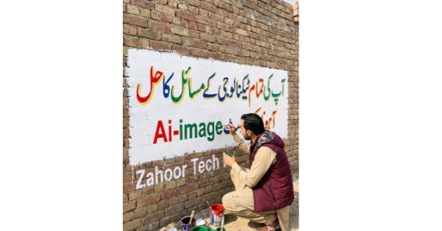‎Beneath the main Urdu text, in smaller English letters, the words “Ai-image” are painted in red and green, bridging the gap between cultures and audiences.